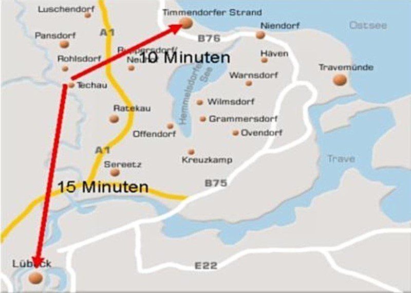 Ihre erste Frage wird sein wo dieses Techau eigentlich liegt. Auf jeden Fall nicht am Ende der Welt. Sogar ein Wetter, ob gut oder schlecht, haben wir zu bieten. Von Techau sind Sie in 10 Minuten an der Ostsee (Timmendorfer Strand, Scharbeutz) und in 5 Minuten im Kurort Bad Schwartau, selbst Lübeck mit seiner historischen Altstadt und seinen Einkaufsmöglichkeiten ist in 15 Minuten zu erreichen. In Ratekau (5 min) gibt es Einkaufsmöglichkeiten (REWE, Aldi, Bäckerei, Apotheke u.v.m.). Falls Sie ärztlich Hilfe brauchen sind mehrere Arztpraxen im Ort.